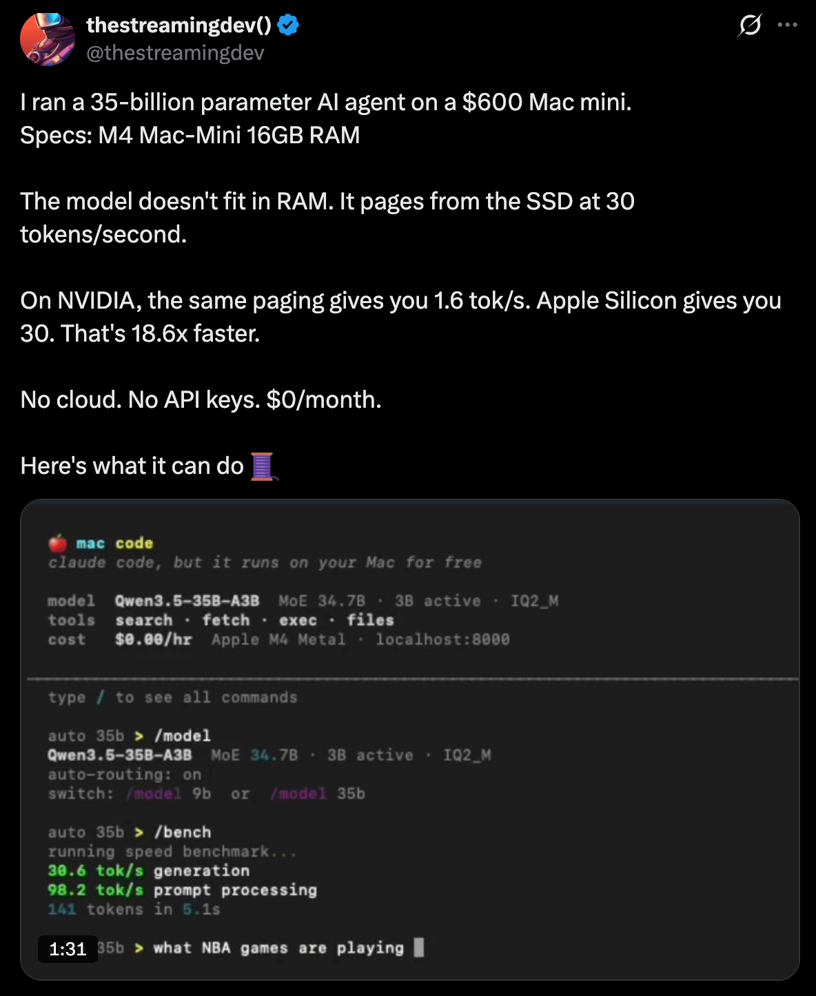 Running a 35B parameter AI agent on a $600 Mac Mini